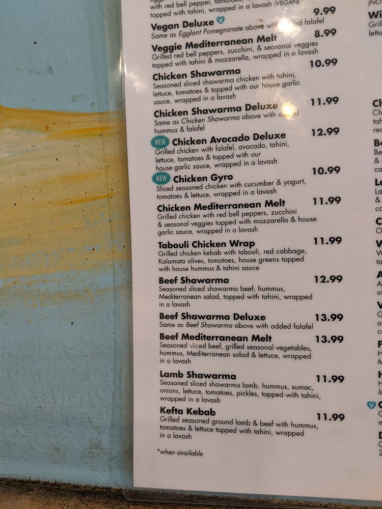 Seasoned sliced beef, grilled seasonal vegetables, hummus, Mediterranean salad, and lettuce wrapped in a lavash